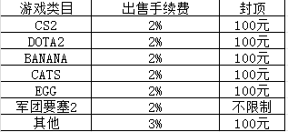 DOTA2、CS2、BANANA、CATS、EGG、军团要塞2出售手续费为2%,其他游戏出售手续费为3%。
