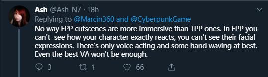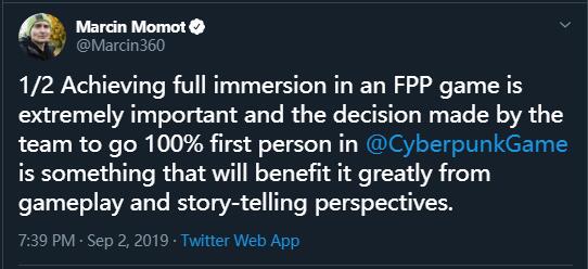 此前我们已经知道,不同于《巫师3》,开发商CDPR旗下的另外一款即将发售的开放世界大作《赛博朋克2077》主要的视角已经变成了可能有些玩家不太适应的第一人称视角(简称:FPP)。而在近日,又有游戏开发者在回复中表示,游戏的第一人称视角将更加彻底,已成为一款“100%”的FPP游戏,此前游戏中的一些过场成为第一人称视角(甚至是羞羞的场景)。CDPR进一步推进游戏的第一人称视角,也在国外玩家中间引发了广泛的讨论。针对此,CDPR全球社区经理Marcin Momot,昨晚在推特上做出了回应解释。
