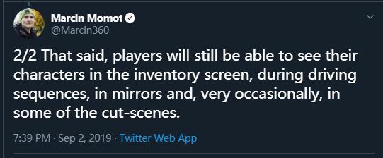 当然Marcin Momot也进一步回复中表示,在游戏中的物品栏界面、驾驶环节、镜子中以及偶尔的过场中,玩家还是能看到玩家创建的角色。