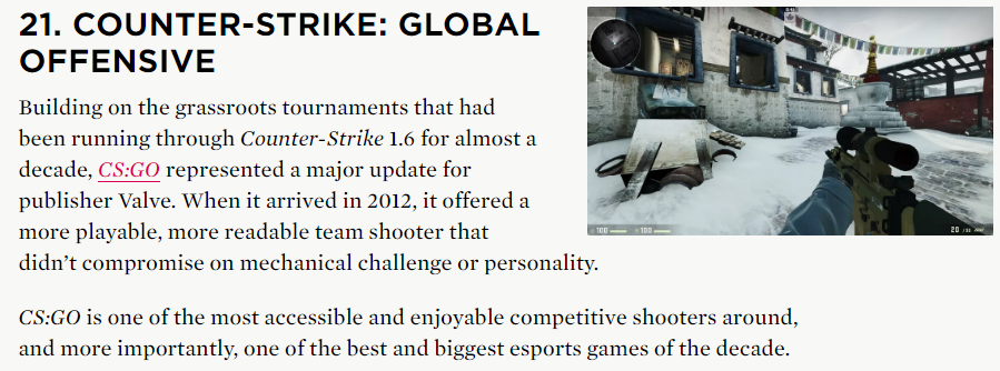 继续往下翻,熟面孔就更多了,常年登顶畅销榜的PUBG排名第11,《守望先锋》排在第19位,而最近人气暴涨的《CS:GO》排在第21位,名次居然在《风之旅人》之后。看来除了人气热度,这次的榜单也非常看重游戏的内涵和艺术高度。