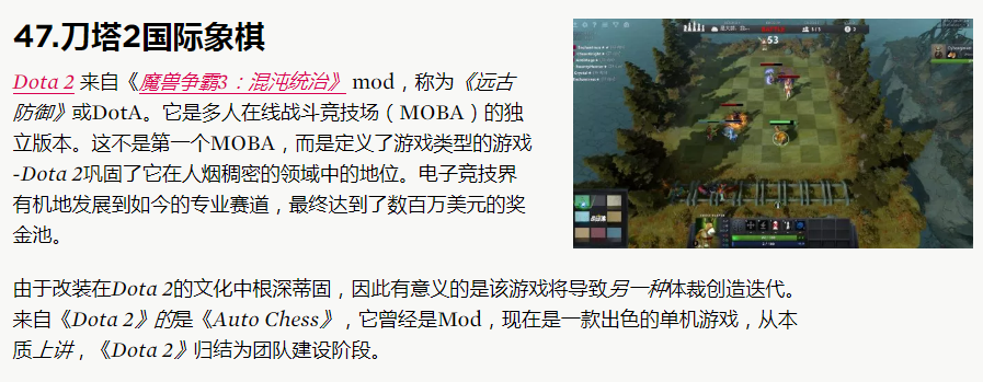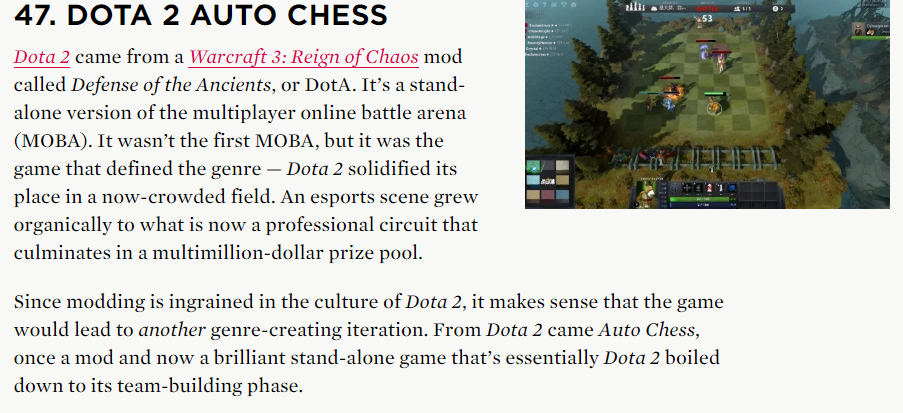然而尴尬的是,《刀塔自走棋》虽然登上了这个榜单,然而作为其“启动器”的Dota2却并没有出现在前一百名中,难不成《Dota2》在国外主流游戏媒体眼里真就是“Dead Game”了?